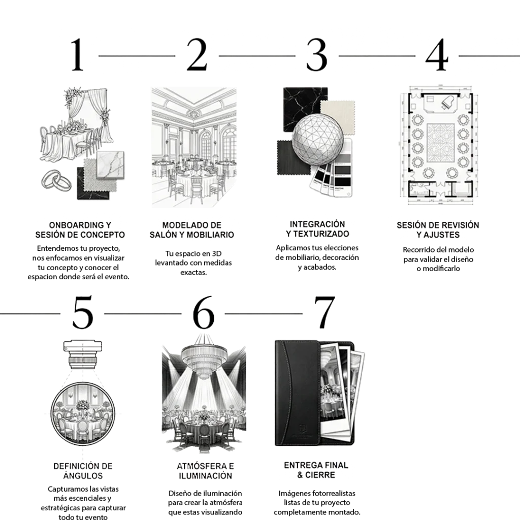 Transformamos tus ideas en una réplica digital de como imaginas tu evento. Sabrás cómo se ve, cómo fluyen los espacios y cómo se siente la atmósfera mucho antes del primer montaje.
